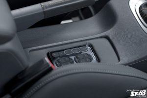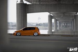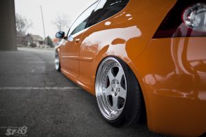 While you’ll find a few of the commonly seen elements on Erin’s GTI, such as the 3 piece Rotiform ROC wheels. At 18×9 et35 and 18×9.5 et29, these are pretty cliche, right? Oh sorry, lets just throw on some crazy pink or green paint and they’ll fit right in. Right?